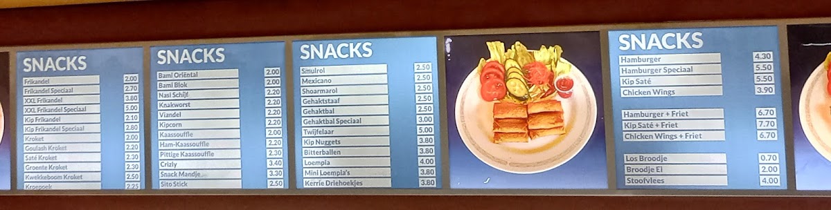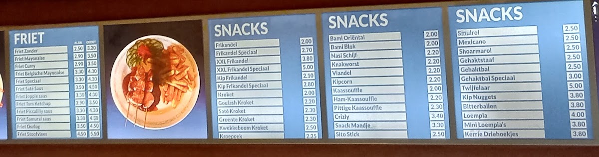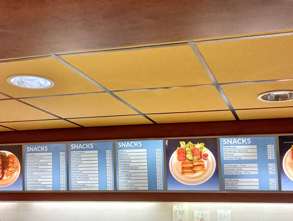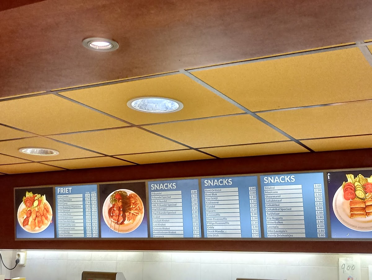 The menu at Cafetaria De Edison is designed to cater to a variety of quick and casual dining preferences, featuring offerings typical of a cafeteria, fast food restaurant, and wok restaurant. Available food options include fast food items such as fries and snacks, as well as wok dishes prepared to order.